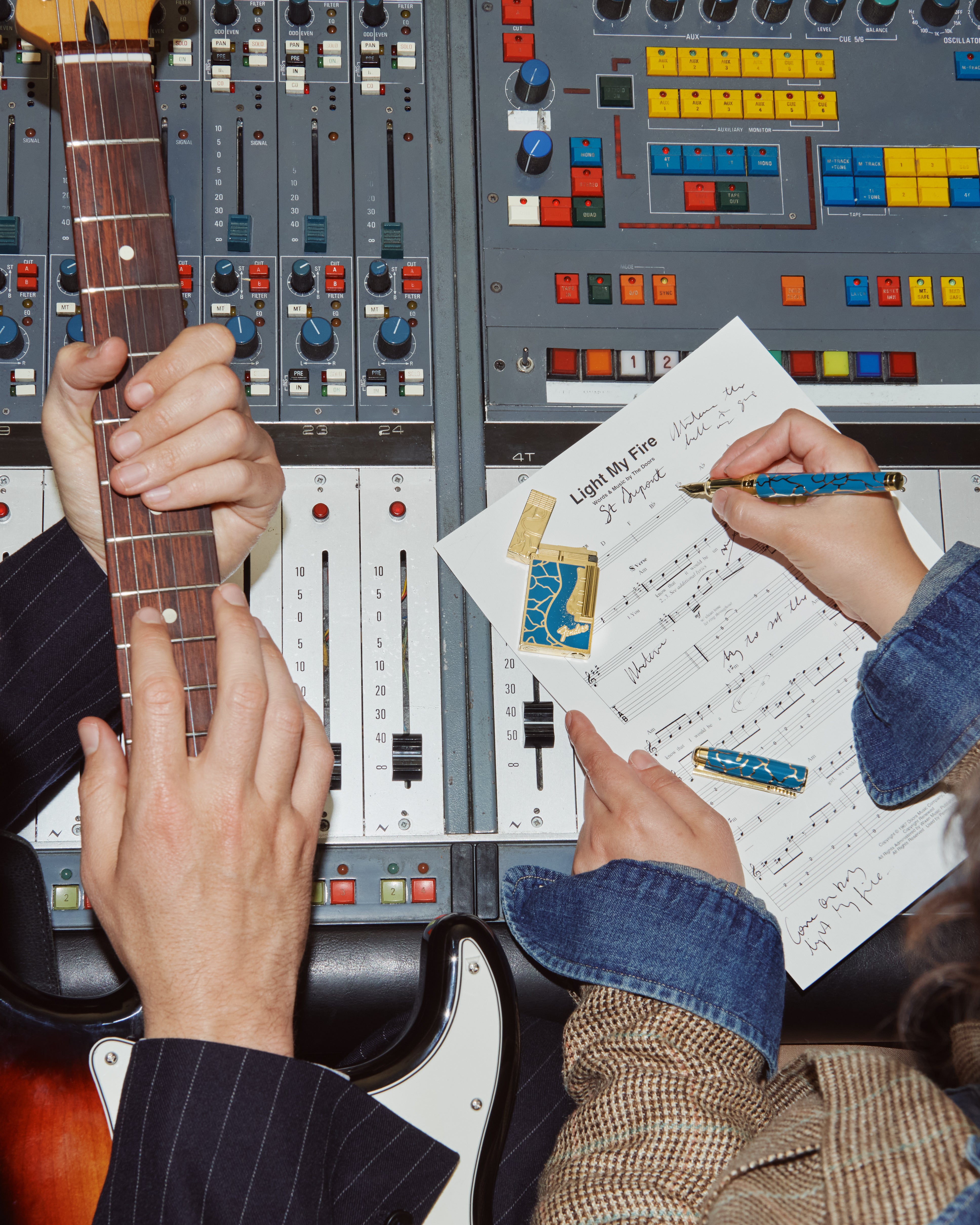 La collezione si estende agli accessori e alla pelletteria. Guillochage e lacca ispirati al kintsugi incontrano una tela grigia testurizzata, richiamo alle celebri custodie Fender in tweed. La linea Access reinterpreta invece gli essenziali della Maison — gli accendini Biggy, Slimmy e Twiggy, oltre alla penna a sfera Initial — adornati con la silhouette della Stratocaster su sfondo di lacca nera.