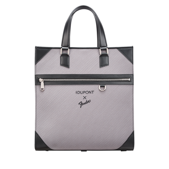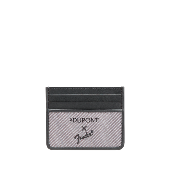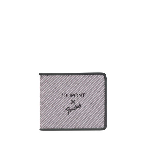 La collezione S.T.DUPONT X FENDER è anche composta da una gamma di pelletteria in tela grigia con motivo diagonale ispirato all'iconico Tweed delle coperture Fender.