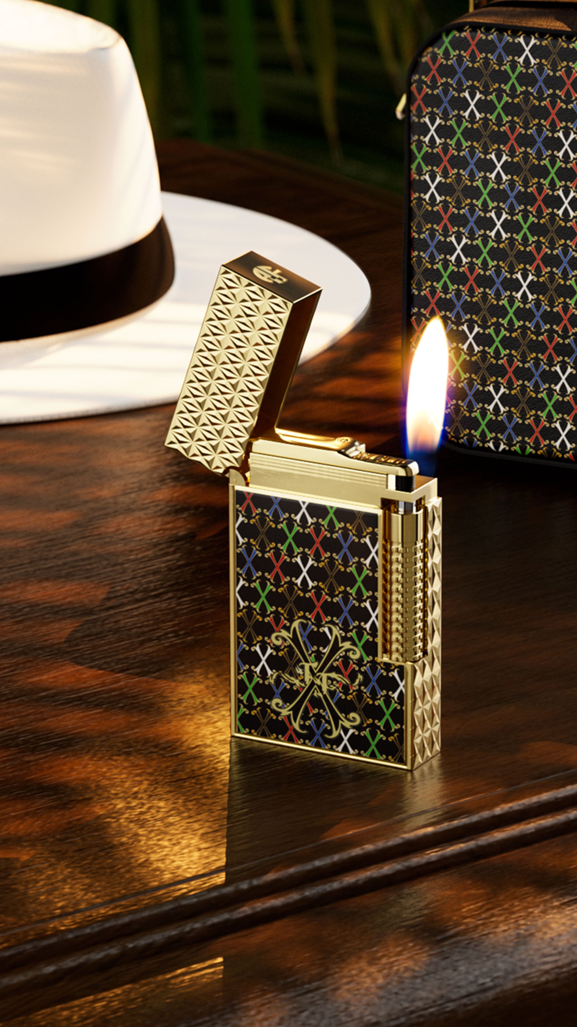 S.T. Dupont collabora con il marchio di sigari Fuente in una collezione che rende omaggio al savoir-faire e all’eccellenza di entrambe le Maison. Tra le loro caratteristiche comuni, una creatività che si ritrova in un inedito monogramma “X”, che richiama le bande colorate di questi sigari d’eccezione.