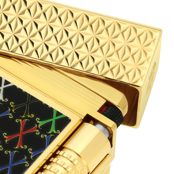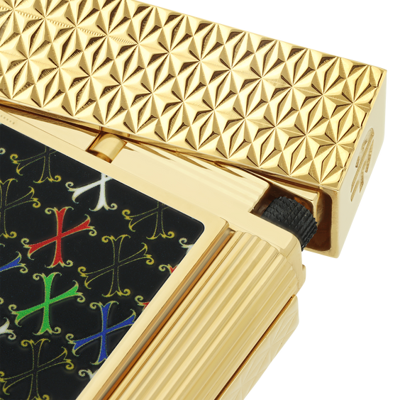Una guilloché a punta di fuoco 3D con finitura dorata adorna il Grand Dupont e la Ligne 2, mettendo in risalto il savoir-faire degli artigiani di S.T. Dupont.