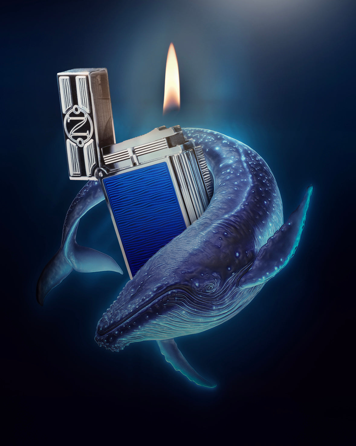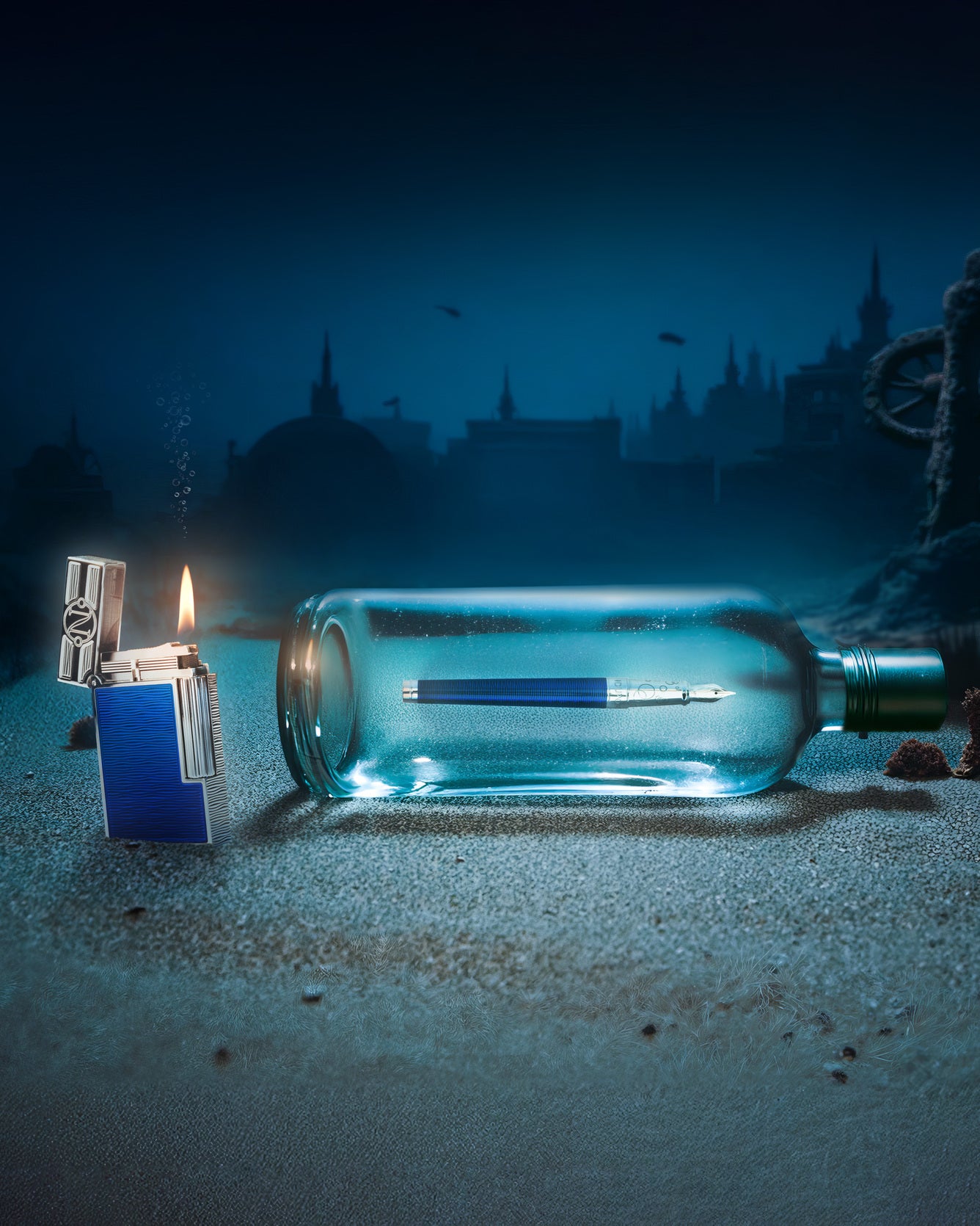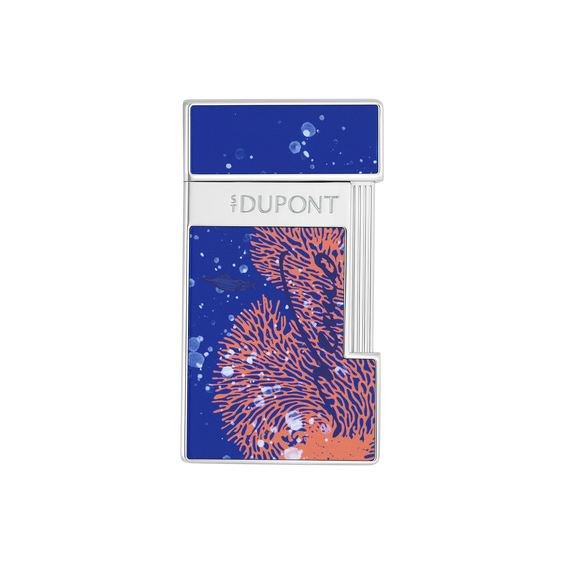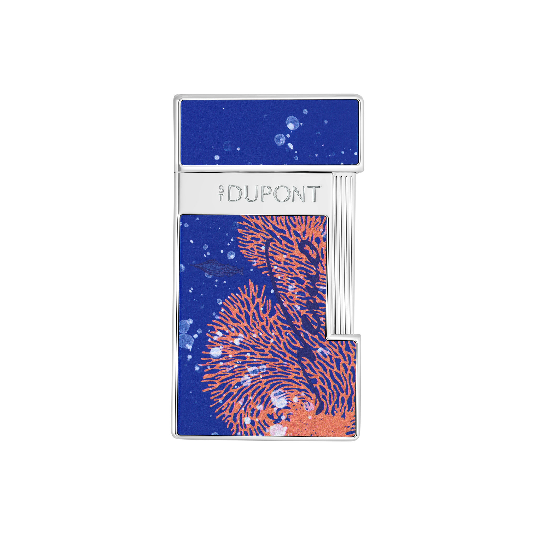 I briquet Biggy, Slimmy e Twiggy, insieme alla penna Défi Millénium, sono impreziositi da lacca lucida blu profondo decorata con bolle e motivi corallo, completati da finiture cromate.