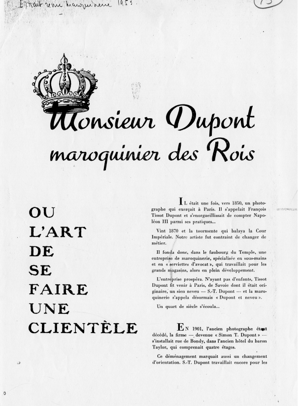 Fotografo di Napoleone III e spirito pionieristico con un occhio attento all'estetica, nel 1872, all'età di soli 25 anni, Simon Tissot Dupont aprì il suo primo negozio di pelletteria a Parigi. I suoi bauli da viaggio personalizzati divennero presto l'accessorio definitivo per l'élite europea. I principali negozi della fine del XIX secolo, come i Grand Magasins du Louvre, lo scelsero come fornitore e personalità come Eugénie de Montijo ordinò il suo beauty case a Dupont.